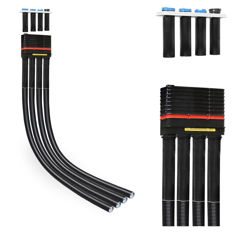 Reihenanordnung und 4 Anschlussmuffen mit integriertem biegesteifen Mantelrohr