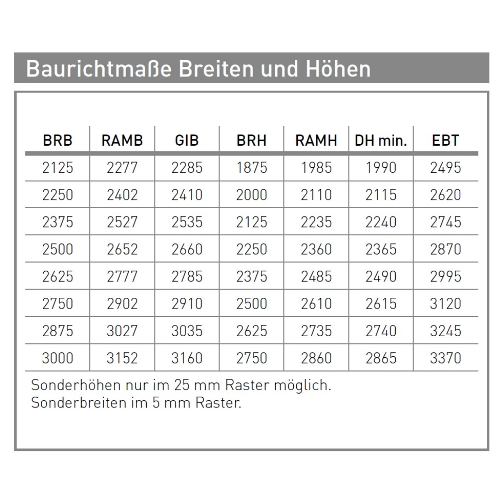 | Normgröße BxH (Baurichtmaße): | 2375 x 2000 mm (B x H), 2375 x 2075 mm (B x H), 2375 x 2125 mm (B x H), 2440 x 2050 mm (B x H), 2500 x 2000 mm (B x H), 2500 x 2075 mm (B x H), 2500 x 2125 mm (B x H) |