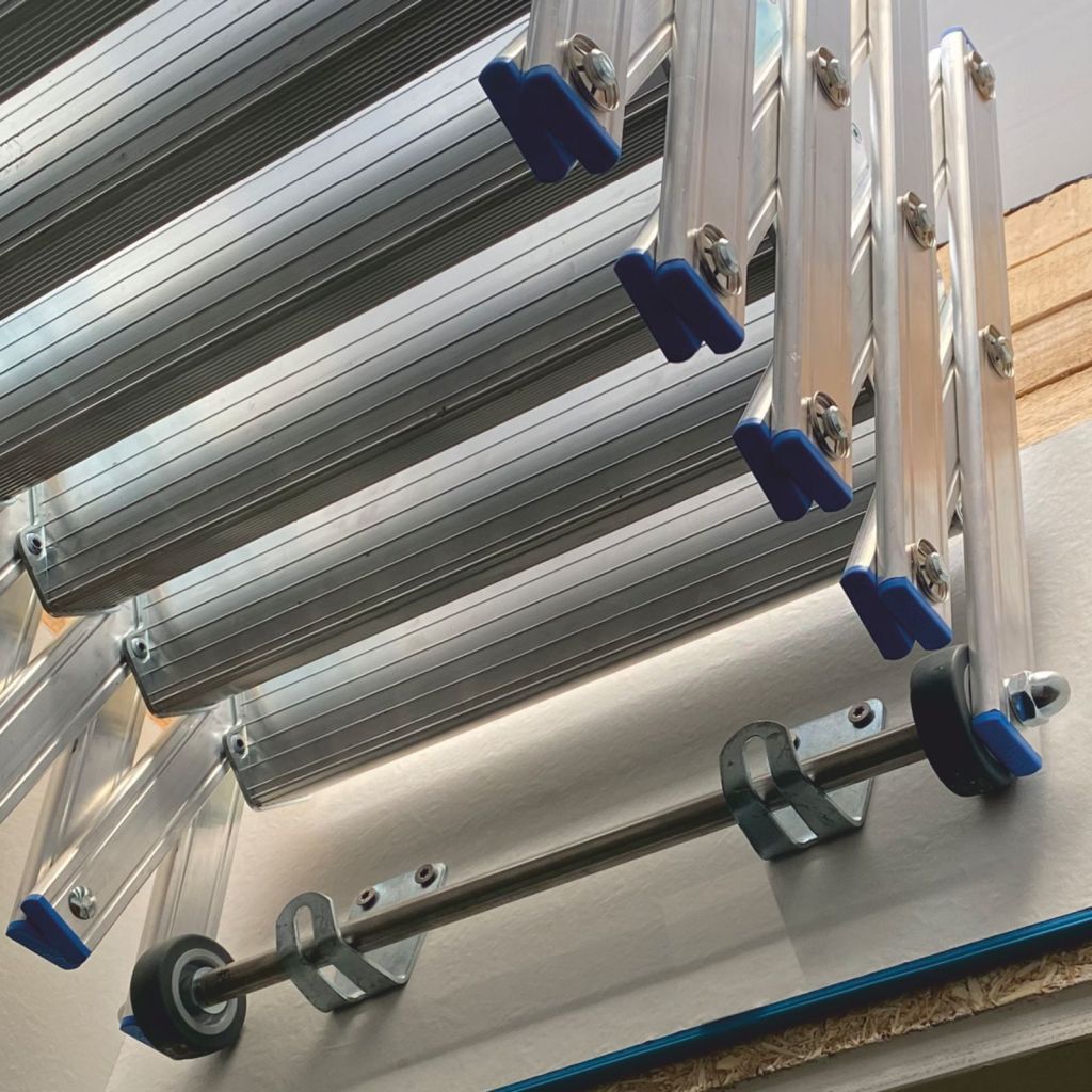 Diese unterscheidet sich von der neuen Variante (für senkrechte Wandmontage) durch kürzere Stützen und einen entsprechend angepassten Haltewinkel, da die Treppe waagerecht an der Wand montiert wird.