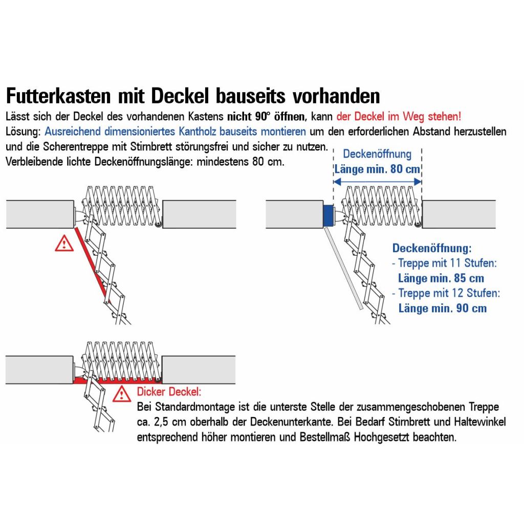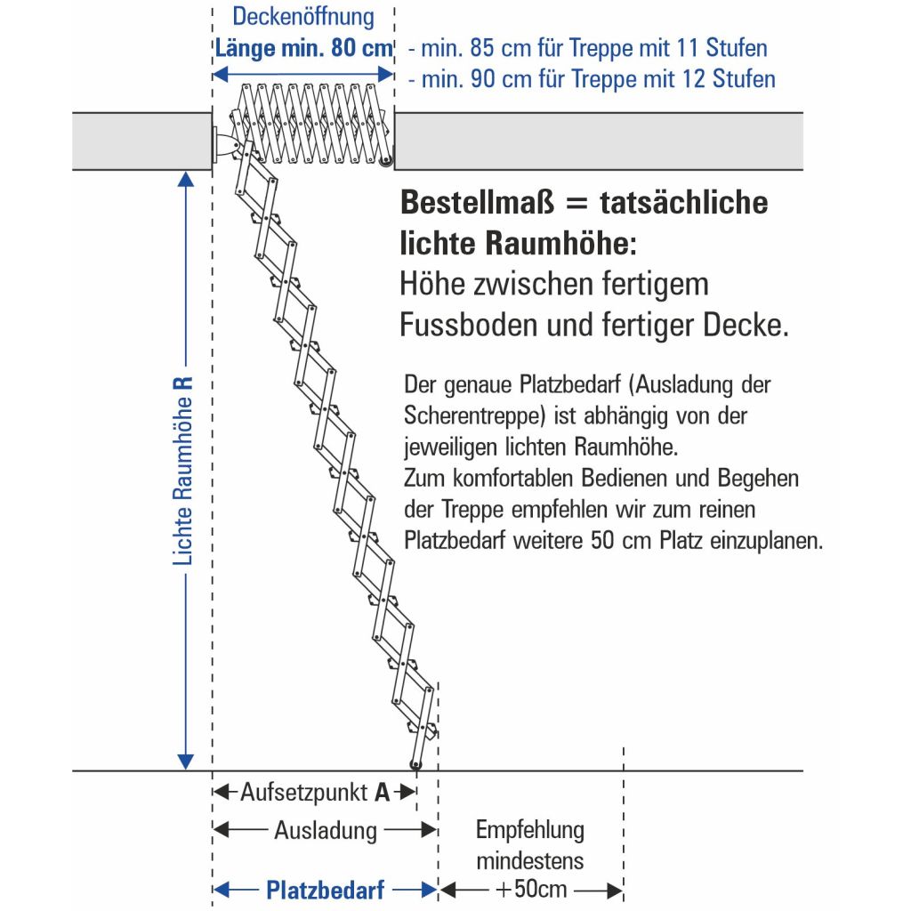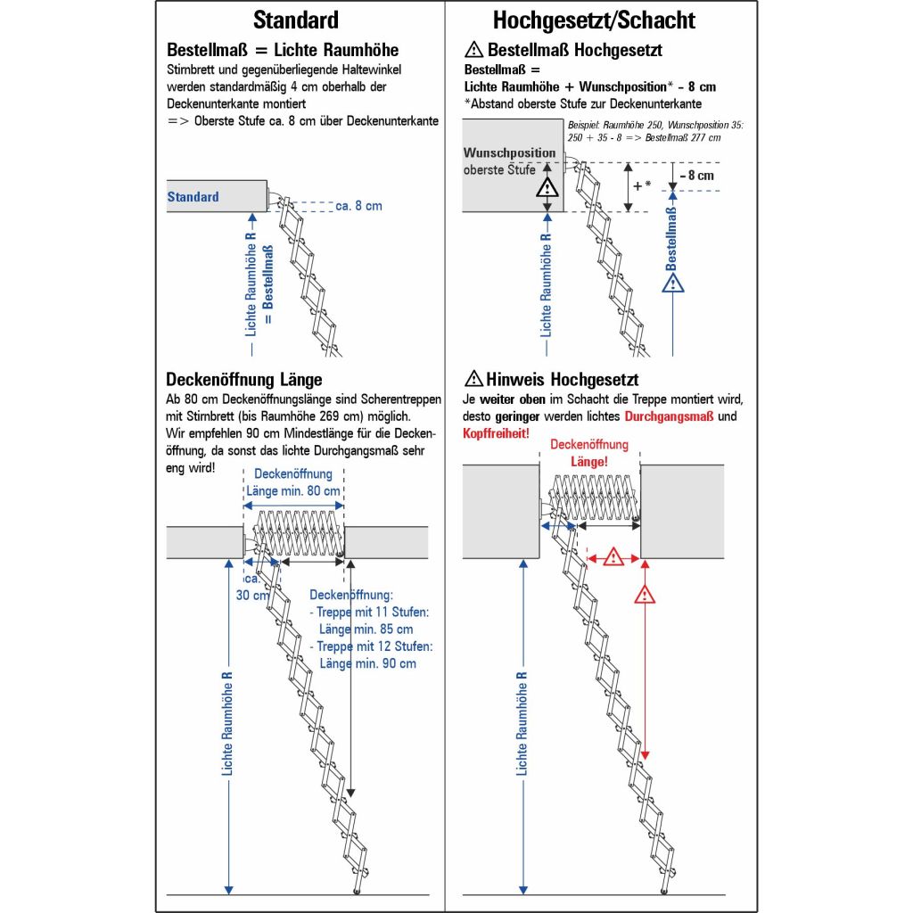 empfehlen 90 cm Mindestlänge der Deckenöffnung, da sonst das lichte Durchgangsmaß sehr eng wird! Bestellmaß = tatsächliche lichte Raumhöhe, d.h. Höhe zwischen fertigem Fussboden und fertiger Decke